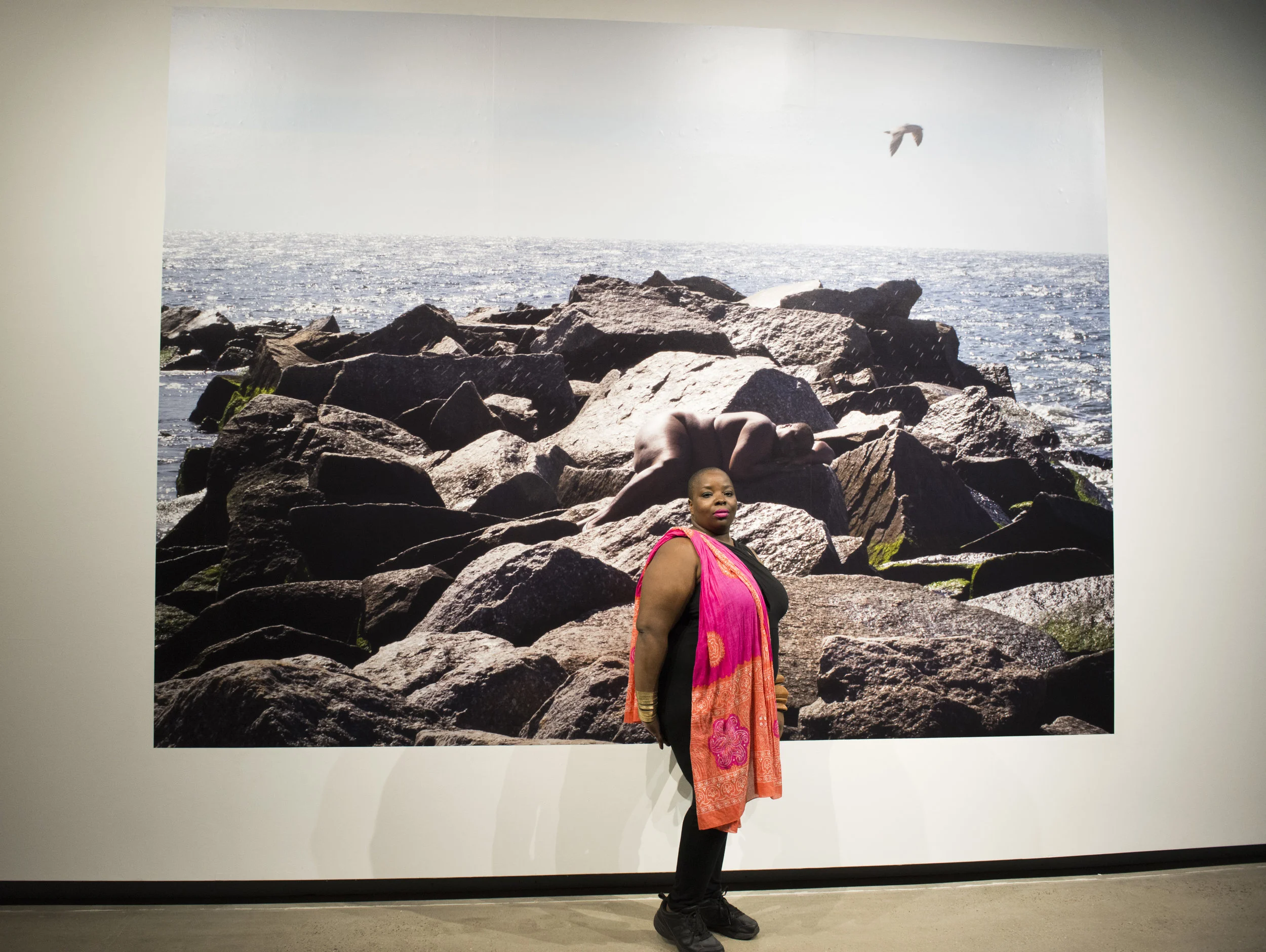 Nona Faustine in front of her work 'She Came to Me One Day' (2012) Photo: Kearra Amaya Gopee